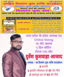 दिव्यांग युवा शक्ति फाउंडेशन में कड़ा मुकाबला, 5 दिन की ऑनलाइन वोटिंग में 130 मत, यूपी में नया प्रदेश अध्यक्ष तय।
