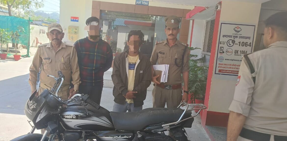 जिसके क्रम मे थाना हाजा से प्रभारी निरीक्षक महोदय के निर्देशन मे पुलिस टीम द्वारा अभि0गण (1)- आसिफ पुत्र मुर्क्करम अली निवासी शक्तिनगर पूछड़ी रामनगर उम्र 27 वर्ष व (2)- फैजान पुत्र बल्लन ठेकेदार निवासी गुलरघट्टी गोश्यामस्जिद रामनगर उम्र 21 वर्ष को चोरी हुई मो0सा0 UK04W9145 के साथ मुखबिर खास की सूचना पर काशीपुर रोड पर आम के बगीचे से गिरफ्तार किया गया ।