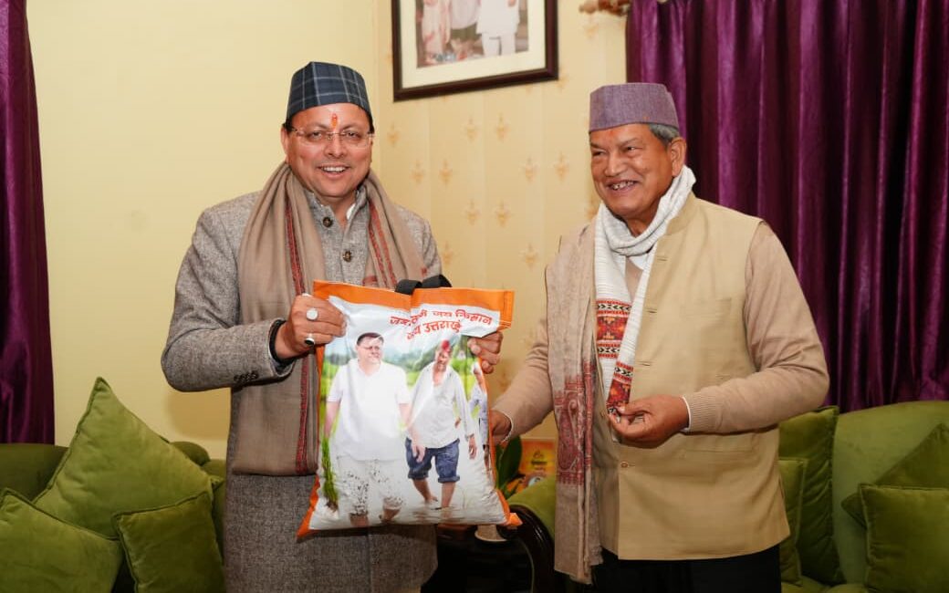 मुख्यमंत्री पुष्कर सिंह धामी ने पूर्व मुख्यमंत्री हरीश रावत से की शिष्टाचार भेंट, अपने खेत का चावल किया भेंट।