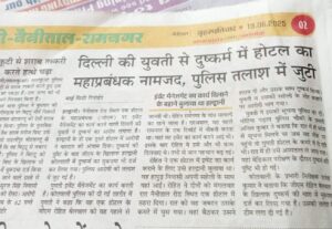 नैनीताल रोड स्थित एक होटल के महाप्रबंधक (जीएम) पर दिल्ली की एक युवती ने दुष्कर्म का गंभीर आरोप लगाया है। पीड़िता इवेंट मैनेजमेंट का कार्य करती है और पेशे से जुड़े सिलसिले में हल्द्वानी आई थी। पुलिस ने आरोपी के खिलाफ मुकदमा दर्ज कर उसकी तलाश शुरू कर दी है।